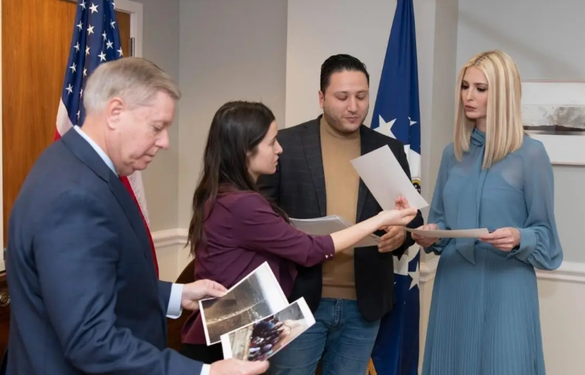 كما كشفت لإيفانكا قصص معاناة أهل سوريا والهجمات التي يتعرّضون لها، مطلعة ابنة الرئيس والسيناتور البارز على صور لنزوح آلاف السوريين بسبب القصف العشوائي الذي يتعرّضون له.
